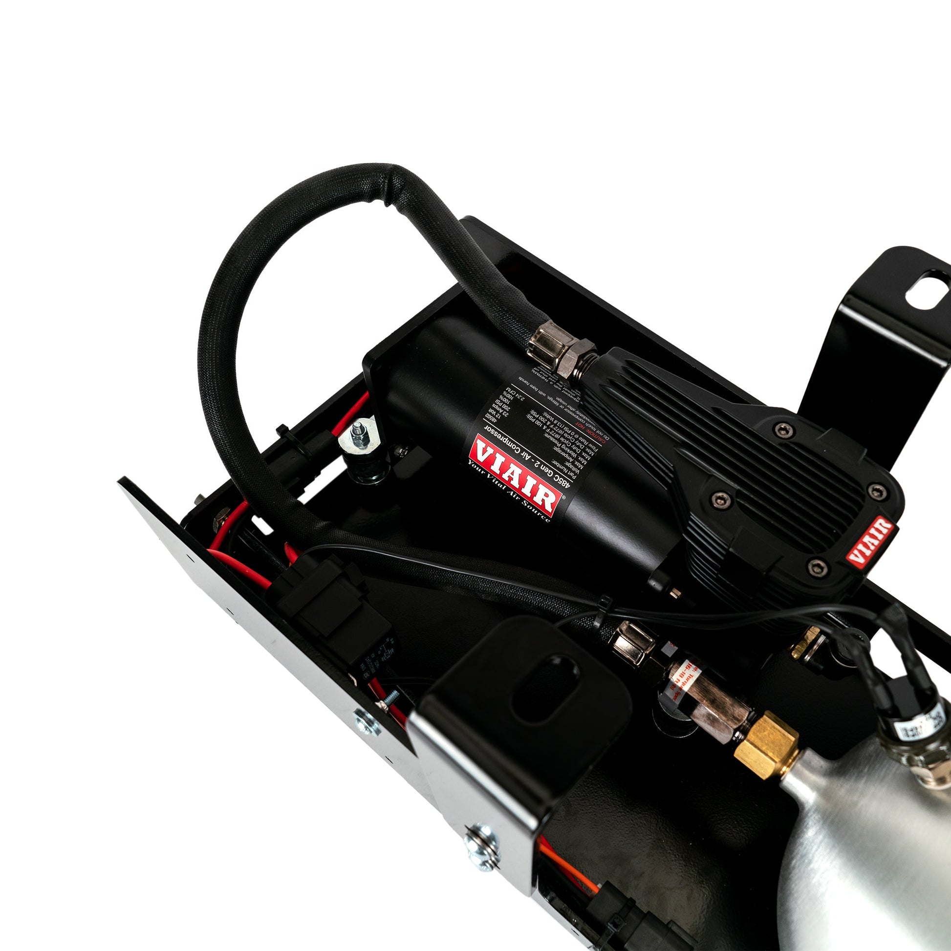 This kit includes a powerful 3 gallon air tank and one 485C VIAIR Stealth Black Compressors with thermal overload protectors to ensure optimal performance in even the toughest conditions. Whether you're airing up your tires after a thrilling trail ride or powering air tools for a quick repair, this kit has got you covered.