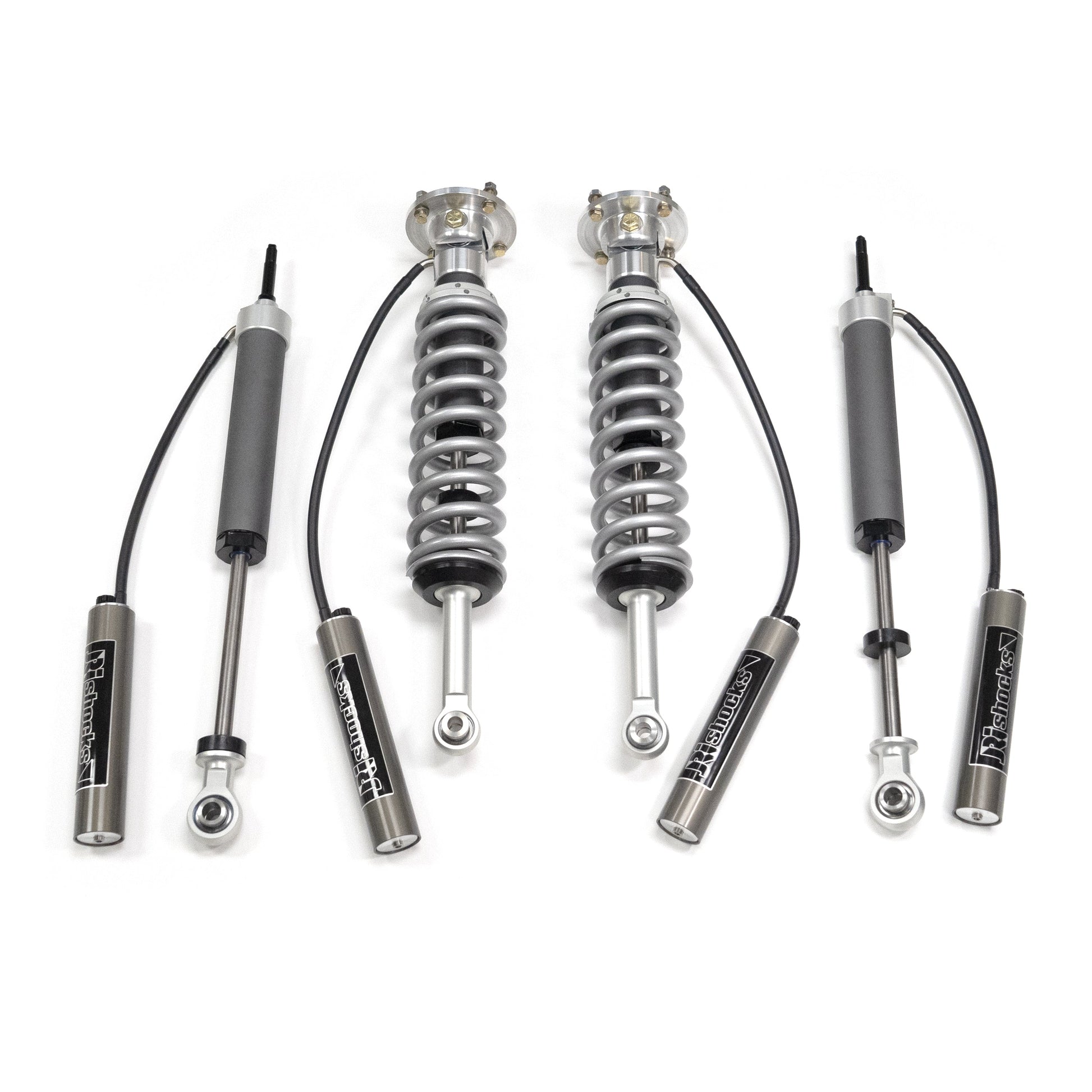 The front shocks are designed for a 1.75-inch to 3-inch lift but allow finer ride height adjustment via the spring preload. All four shocks feature 2-stage remote compression adjusters on each reservoir, allowing you to fine-tune your suspension to correlate with your terrain and comfort.Â